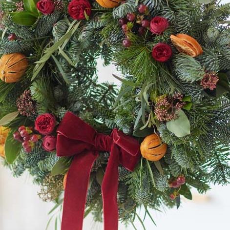 A touch lovelier than our standard wreath, this one will feature more blooms, or more luxurious blooms (or both!) It'll feature gorgeous fresh blooms and foliage. Expect shades of red and green, with peach and cream highlights and pops of burgundy and cerise.