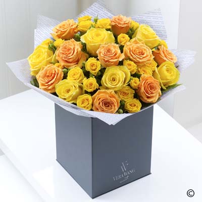 Featuring Cosima light orange roses, Good Times yellow roses and Shine yellow spray roses, expertly hand-tied with salal and leather leaf, and finished with luxurious Vera Wang gift wrapping.
