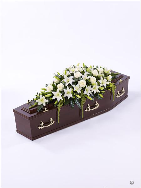 Beautiful Asiatic Lily and large-headed Rose in pure white are used to create this elegant casket spray. The fresh flowers are enhanced with trails of green amaranthus as well as ruscus, aralia leaves and eucalyptus. Approximate height 184cm (6ft).
